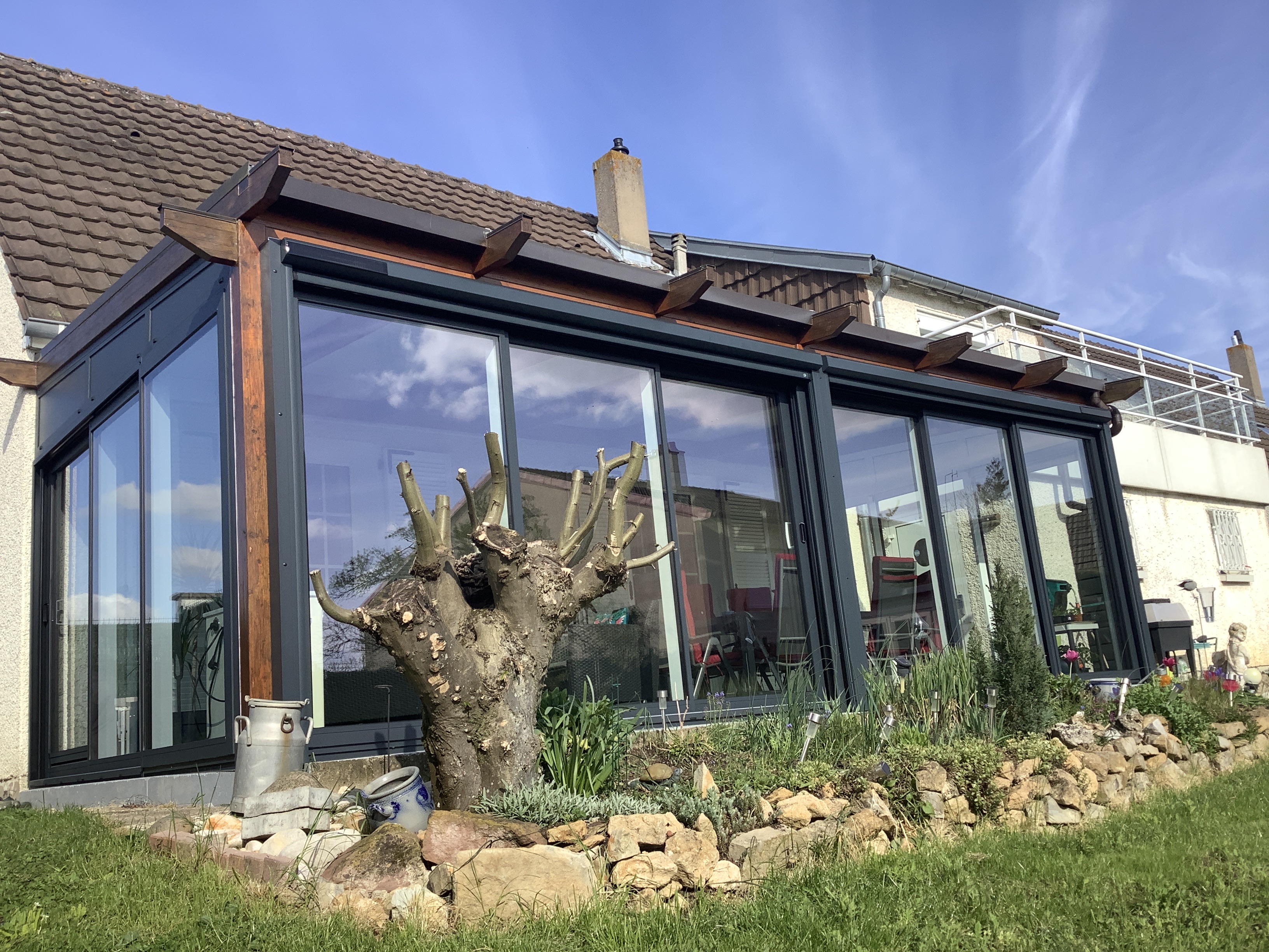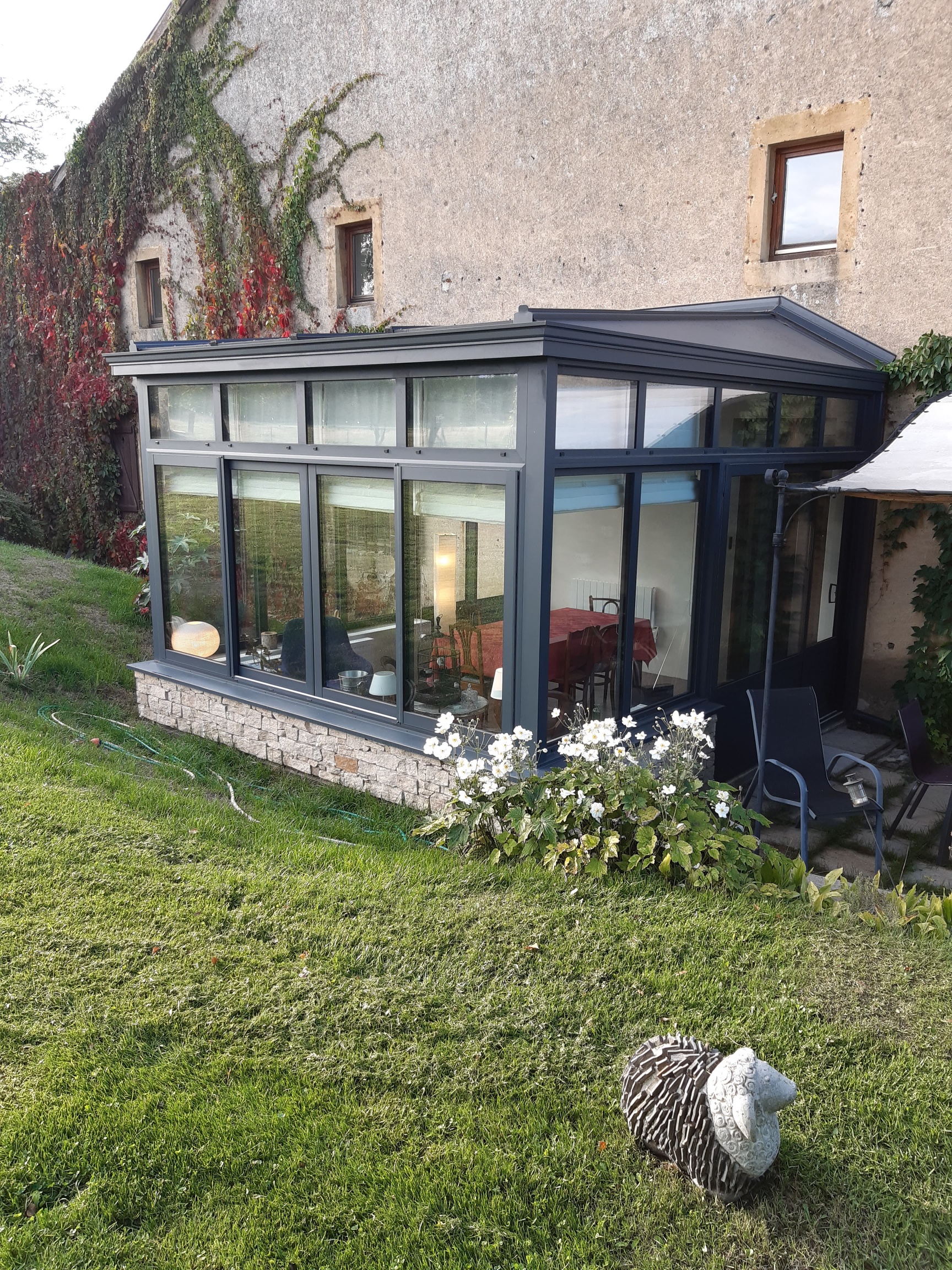 Nous avions décidé de l'ajout d'une véranda de style anglais à notre maison, cela nous avait beaucoup plu lors d'un séjour en Angleterre car il s'agit là-bas d'une pièce cocooning faisant office de salon ou salle à manger, il y a un sous-bassement en pierre apparente, un plancher, des impostes sur les parois vitrées et des rideaux bateau. La société GRAU ALU a très bien compris notre demande et a répondu exactement à toutes nos attentes. Un hiver et un été sont donc passés et nous pouvons dire maintenant que nous sommes entièrement satisfait de cette belle réalisation, nous n'imaginions jamais y passer autant de temps et y prendre autant de plaisir.
