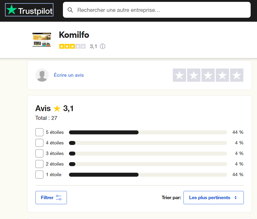 Faites attention, en tant que développeur web, je suis tombé sur leur site lors de recherches pour le développement d'un logiciel pour un client. Il y a une énorme disparité entre les avis affichés sur leur site et ceux présents sur d'autres plateformes d'évaluation. Pouvez-vous justifier la note de 4.9 avec précisément 10 220 avis, alors que sur d'autres sites, les notes finales tournent autour de 3, comme sur Trustpilot par exemple, avec une note remarquable de 3.1 avec 44% d'avis à 1 étoile ! (voir les images ci-dessous). Je suis soucieux de la transparence et je n'apprécie pas la publicité mensongère. C'est pourquoi je me permets de partager cet avis pour informer les utilisateurs. Il est devenu facile de rédiger des centaines d'avis positifs (et encore plus sur un site Web !), donc je vous recommande d'être prudents lorsque la note semble trop parfaite. Dans certains cas, les commentaires négatifs sont à privilégier. Ayez du bon sens et soyez vigilants ! :)