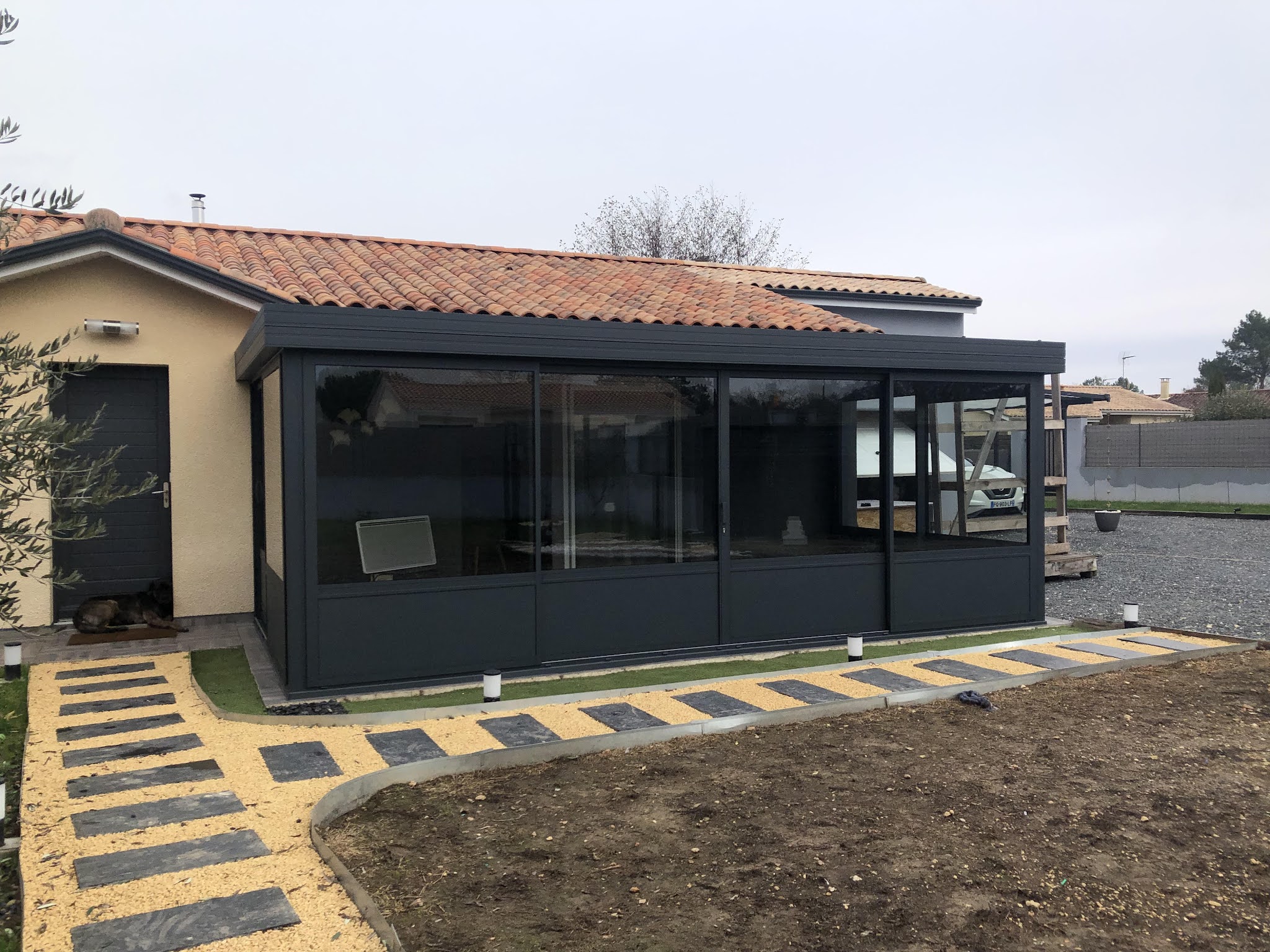 Pose d'une véranda ,de marquises et puits de jour intégré. Parfaitement intégrés à la structure de la maison. Après moultes difficultés à trouver une entreprise capable de réaliser ce type de travaux, nous avons eu la chance de trouver l'Atelier de la Création qui a parfaitement compris ce que je souhaitais (puits de jour à plat et véranda en verre à pente très faible). Je n'aurais pu rêver mieux !