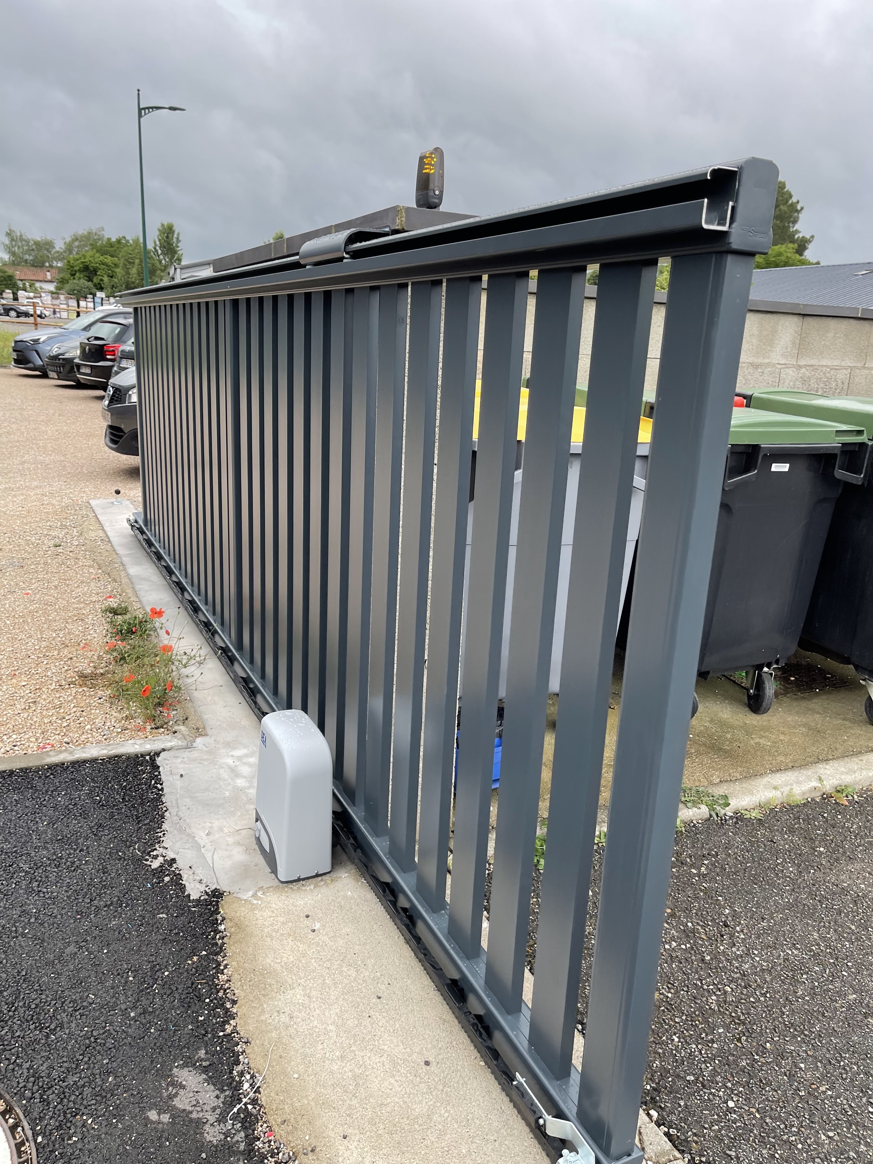 Portail coulissant motorisé alu laqué grande largeur. Bon rapport qualité prix. Poseurs pros et agréables.