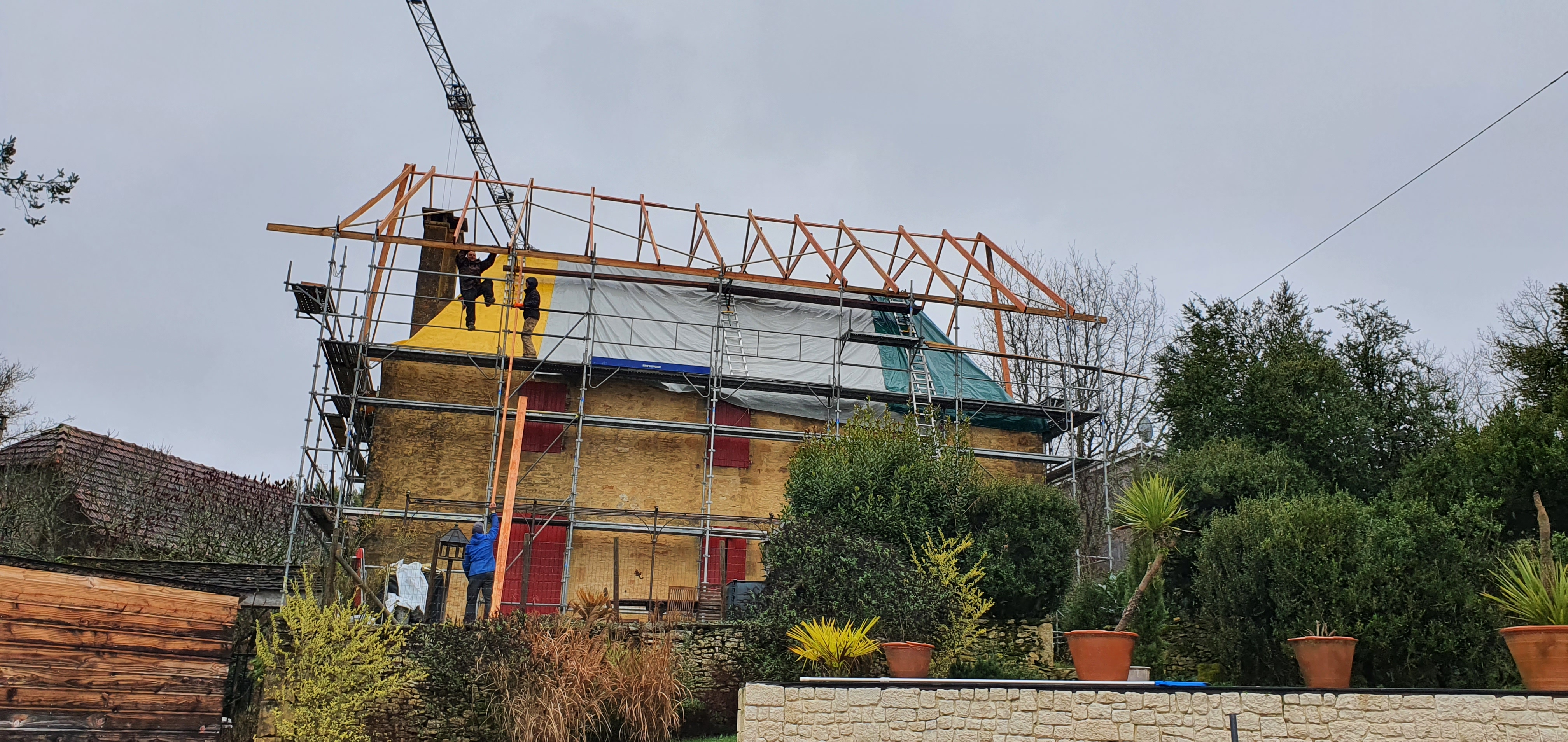 Forts de leur expérience et de leur attachement à leur métier respectif, Grégory et Yannick, nous ont d’abord embarqués dans l’aventure de la réfection de la toiture de notre vieille dame « La Salamandre », qui était coiffée de lauzes. Le chantier a duré un peu plus de deux mois, et nous avons suivi et appris sur leur métier qui est certes très physique, mais au combien enrichissant et valorisant ! Ils ont été riches de conseils, de bienveillance, d’écoute et de partages, tout le long de la métamorphose de notre maison, qui est maintenant revêtue d’ardoise avec chiens assis en bois de chêne plus cossus et cerises sur la toiture les gargouilles, dégueuloire trop plein, descente de gouttière et faîtage en zinc ; qui lui confère un charme plus moderne dans le respect de l’architecture locale ! Ils nous ont également refait le toit de l’ancienne étable qui était en tuiles mécaniques et qui a retrouvé sa superbe, grâce à leurs conseils et à leur volonté de perdurer notre artisanat. Ainsi, de magnifiques tuiles plates de terre cuite, de la tuilerie artisanale « Aupeix », recouvrent avec panache notre gîte « Les Rapiettes » ! Merci à tous deux pour ce travail d’orfèvre et cet amour du travail bien fait, nous vous les recommandons … sans modération !