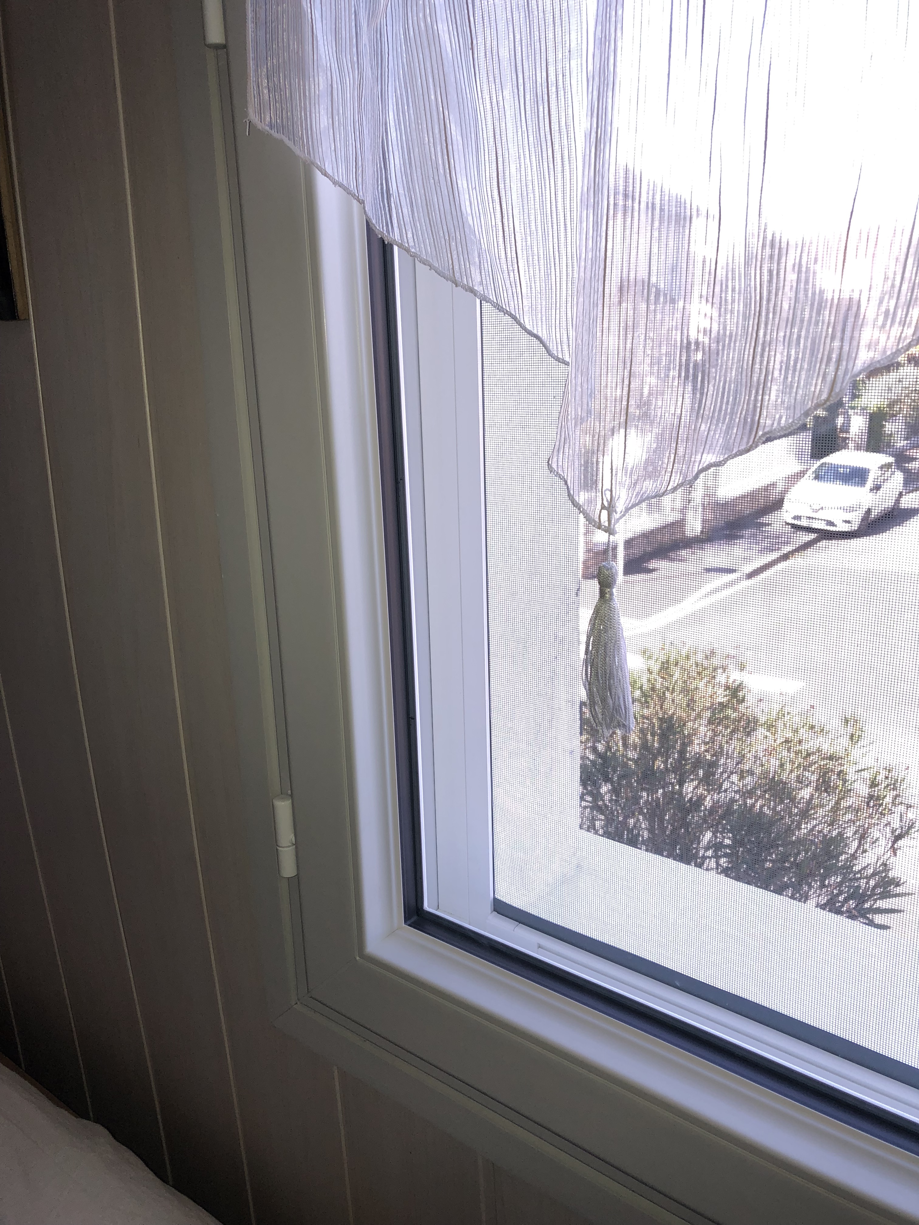 Travail efficace, sans stress et dans le respect de l'habitation pour la pose d'un grand volet cintré en bois.